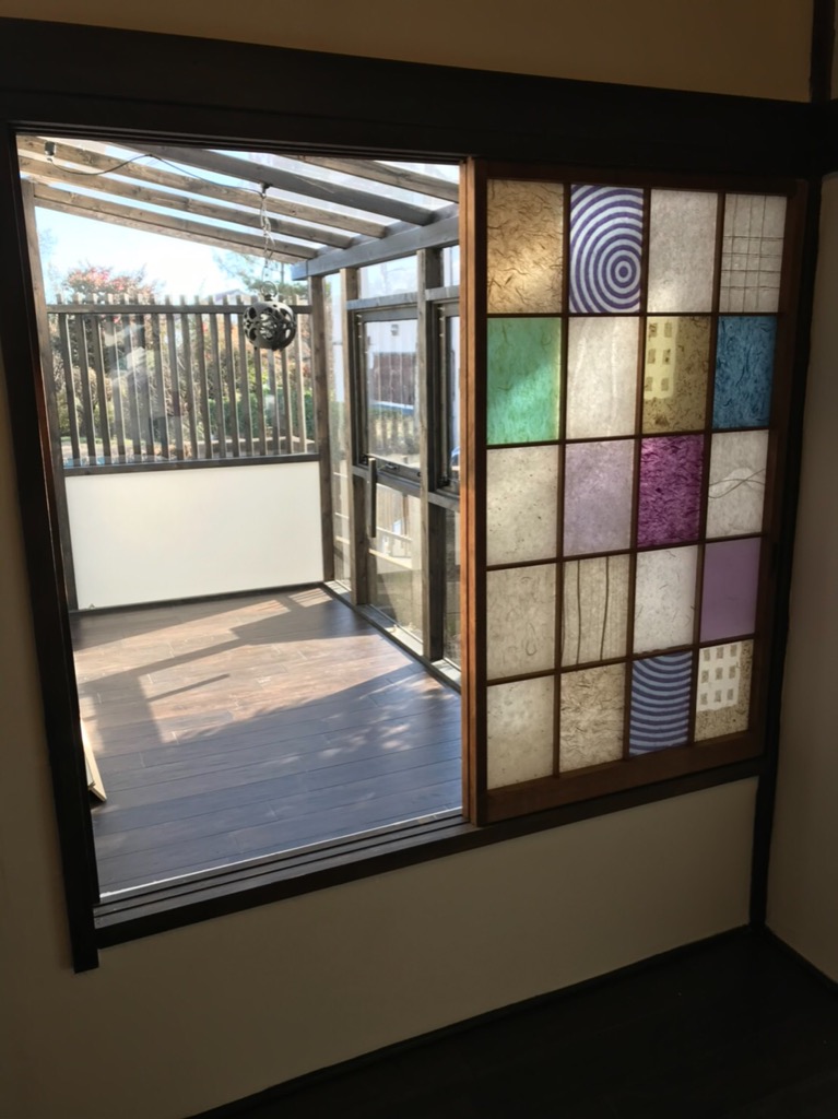 そして、この写真ですごく印象を明るくしている様々な色と柄を持つ個性的なデザインの障子。