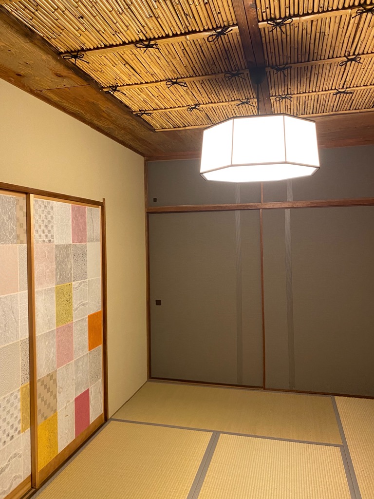 そこにあえて対照的であるカラフルな障子を加えることで、和室本来の居心地の良さやあたたかさを演出しています。